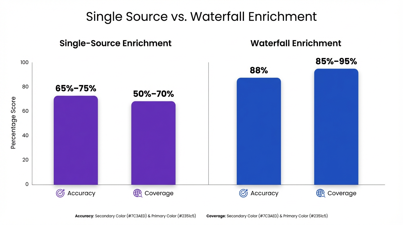 Practitioner benchmarks consistently show waterfall enrichment achieving 88% accuracy versus 65-75% from single-provider approaches.