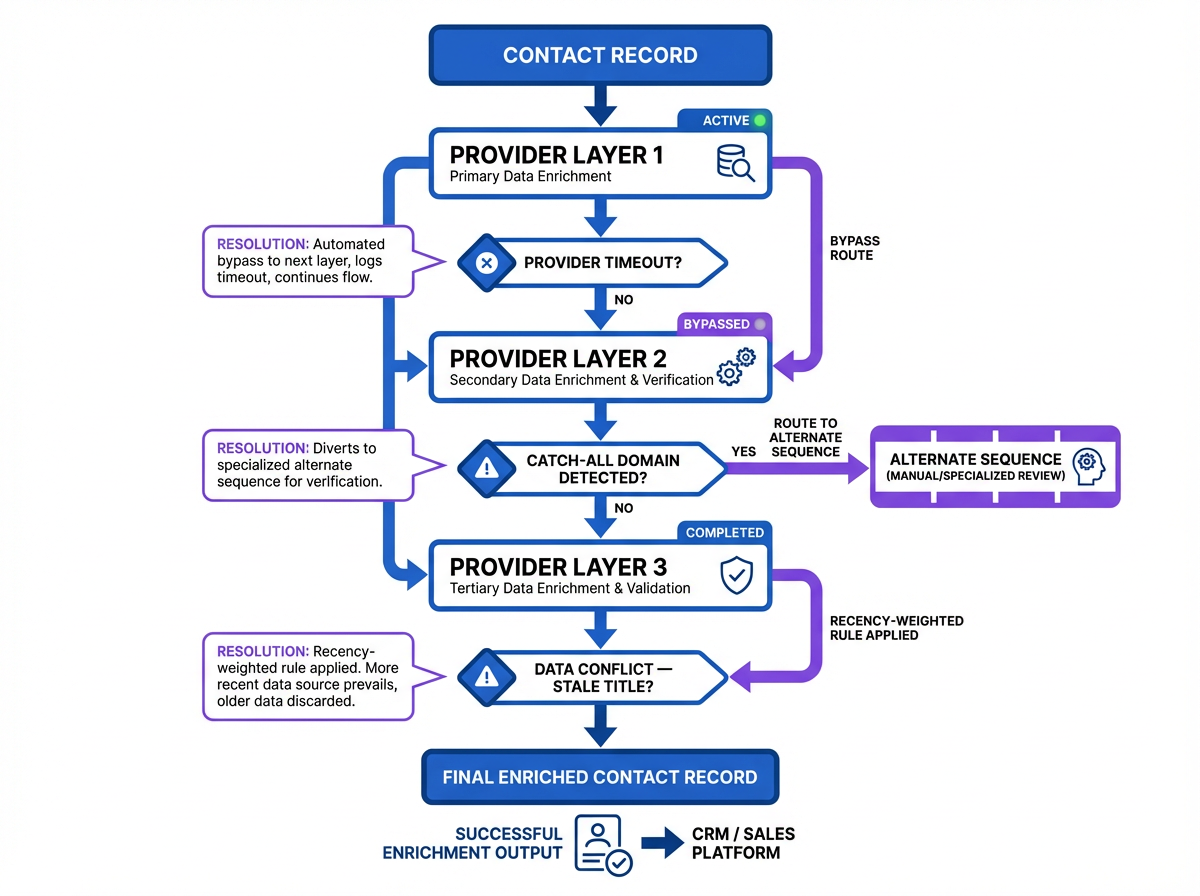 The most common failure mode is provider overlap. If Providers A and B draw from the same underlying data source, your waterfall is not actually adding coverage at Layer 2. It is just adding latency and cost. Before finalizing your provider stack, request a coverage overlap analysis or run a test batch to measure how often Layer 2 returns a different result than Layer 1 would have. High overlap means you need a different provider at that position, not more providers.