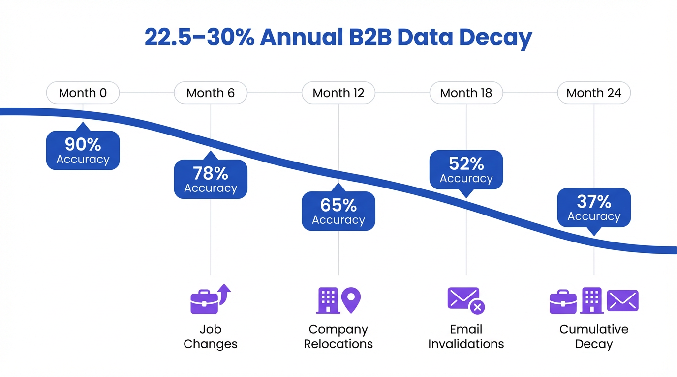 B2B contact data decays at 22.5-30% annually, making continuous enrichment a necessity rather than a one-time project.