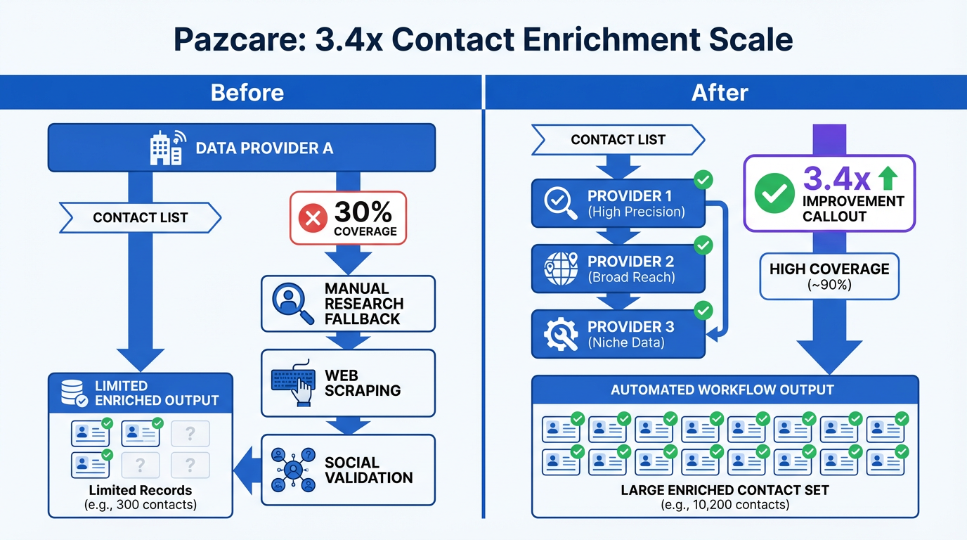 Abstract accuracy numbers are useful, but real outcomes are more convincing. The story of how Pazcare scaled contact enrichment is a direct example of what happens when a growth team replaces single-source enrichment with a waterfall approach.