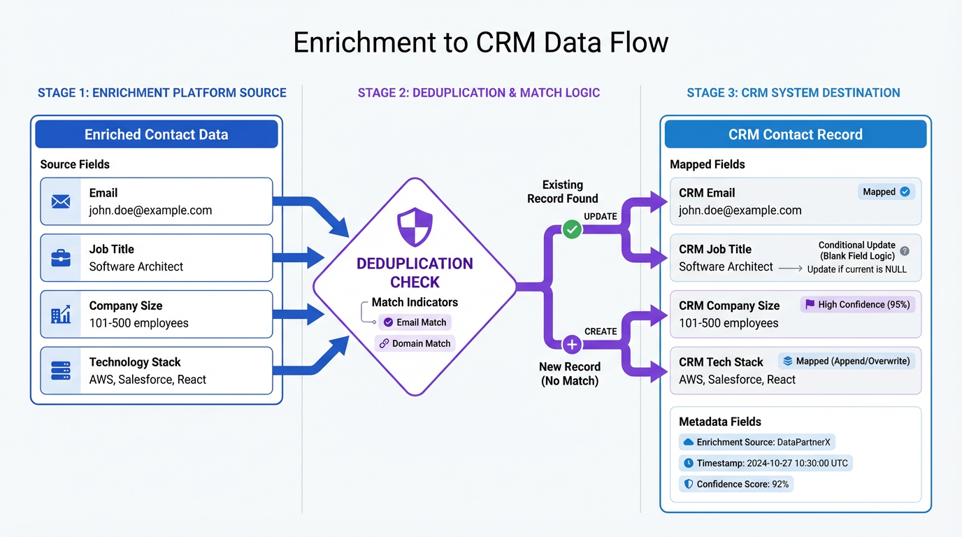 Getting enriched data into your CRM cleanly requires more planning than most teams expect. The two failure modes are duplication (creating new records for contacts that already exist) and field overwriting (replacing manually entered data with enriched values that may be less accurate for a specific account).