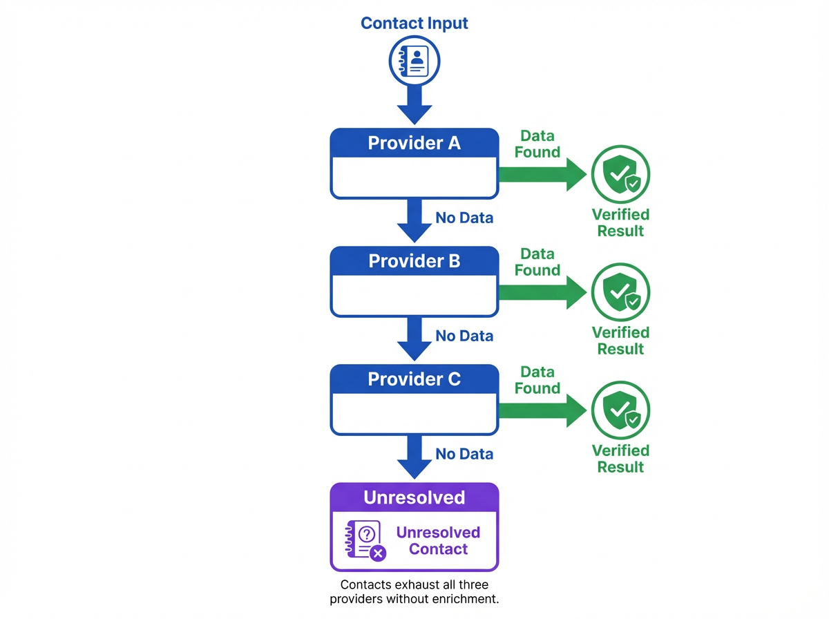 Single-source enrichment has a coverage problem. No one data provider has complete, accurate information on every contact. When you rely on one source and it returns a null result, that lead goes unenriched and either gets skipped or sent a generic message. Waterfall enrichment solves this by querying multiple providers in sequence, stopping when a verified result is found.