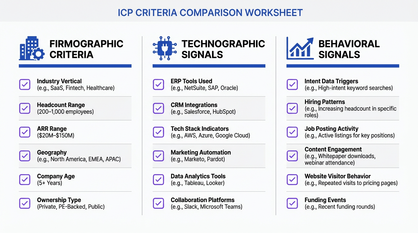 A functional ICP for outbound purposes needs to be specific enough to filter a database, not just describe your best customer in broad strokes. That means firmographic criteria (industry, headcount, revenue range, geography), technographic signals (what tools they use), and behavioral or intent signals where available. For a SaaS company targeting mid-market finance teams in North America, 'mid-market' needs a number: 200 to 1,000 employees, $20M to $150M ARR, using a specific ERP. Vague ICPs produce vague lists.