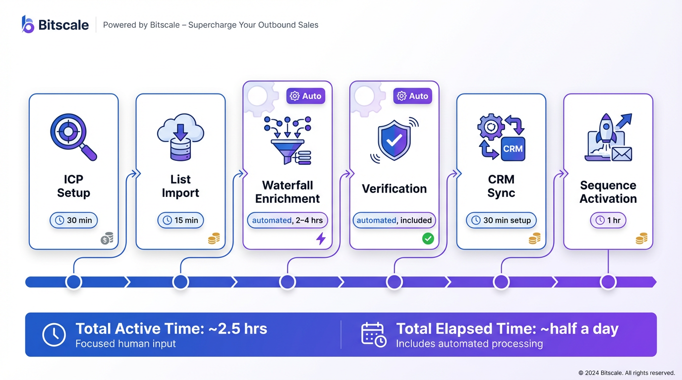 For a practical sense of what this looks like end-to-end, here is a representative run for a 1,000-contact list targeting mid-market SaaS companies in North America. ICP definition and filter setup takes roughly 30 minutes if you have done the strategic work already. Importing a raw list and mapping source fields takes another 15 minutes. Waterfall enrichment across three providers, including email, direct dial, and firmographic data, runs automatically and typically completes in two to four hours for a list this size. Verification runs in parallel and adds no meaningful time. CRM sync configuration, including deduplication rules and field mapping, takes about 30 minutes on initial setup and is largely reusable for future runs. Sequence segmentation and activation takes an hour, assuming you have templates ready.